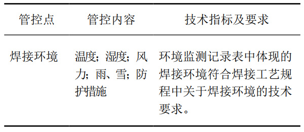 如果自然氣候條件不滿足焊接環(huán)境要求時(shí),應(yīng)采取必要的防護(hù)措施,如防風(fēng)棚、遮雨棚、防風(fēng)保溫棚等。焊接環(huán)境的質(zhì)量關(guān)鍵點(diǎn)如表 5所示。