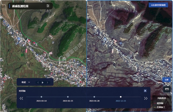 接入全省亞米級衛(wèi)星遙感影像數(shù)據(jù),每月開展一次覆蓋全省范圍的遙感影像數(shù)據(jù)解譯工作,通過遙感解譯識別技術(shù)提取變化圖斑,監(jiān)測中心線兩側(cè)5~200米范圍內(nèi)地形地貌變化情況。利用目標檢測模型對隱患區(qū)域檢測識別建構(gòu)筑物占壓、挖掘施工作業(yè)等隱患。以圖斑疊加于管道數(shù)據(jù)底圖的形式顯示管道周邊占壓、第三方施工等安全隱患情況,服務于管道風險隱患識別、高后果區(qū)認定等業(yè)務。圖 2紅色圖斑為中心線兩側(cè)5~200米范圍內(nèi)解譯識別出來的建筑物占壓。圖 3所示為不同期影像分屏對比,將當期解譯影像與往期影像結(jié)合,查看建筑物占壓歷史變化情況,提升了管道排查的效率和準確性。