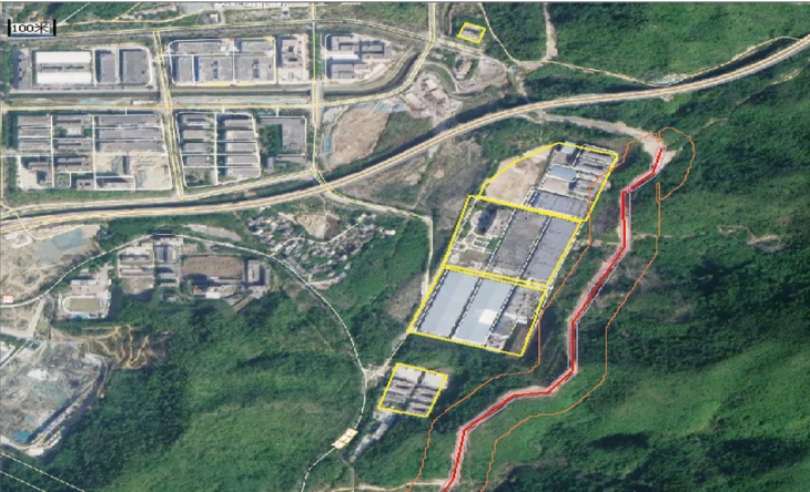 圖 1左上角為比例尺。黃色區(qū)域?yàn)槿丝诜植紖^(qū),紅色為管線走向,藍(lán)色為3×10-5個(gè)人風(fēng)險(xiǎn)等值線,粉色為1×10-5個(gè)人風(fēng)險(xiǎn)等值線,橙色為3×10-6個(gè)人風(fēng)險(xiǎn)等值線。