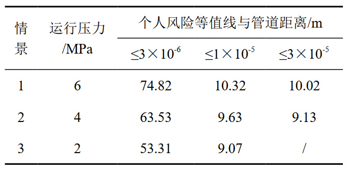 在假設(shè)其它條件不變的情況下,降低管道輸送壓力也會(huì)降低管道風(fēng)險(xiǎn)。假設(shè)情景1為當(dāng)前現(xiàn)狀,情景2為改變運(yùn)行壓力為目前實(shí)際運(yùn)行壓力的2/3,情景3為改變運(yùn)行壓力為目前實(shí)際運(yùn)行壓力的1/3。依次計(jì)算得到采取降壓措施導(dǎo)致個(gè)人風(fēng)險(xiǎn)等值線與管道距離的關(guān)系,計(jì)算結(jié)果(表 3,圖 5)。
