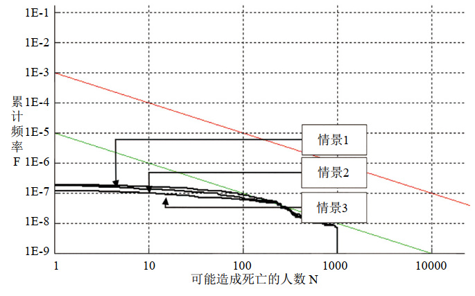 圖 2中紅線與綠線之間的區(qū)域表示可能造成死亡人數(shù)小于1000的區(qū)域?yàn)轱L(fēng)險(xiǎn)可接受區(qū)。紅線之上以及可能造成死亡人數(shù)大于1000的區(qū)域?yàn)椴豢山邮軈^(qū)。綠線之下以及可能造成死亡的人數(shù)小于1000的區(qū)域?yàn)轱L(fēng)險(xiǎn)可接受區(qū)。