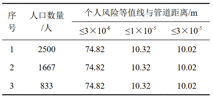 采取人口搬遷或管道改線措施,能使管道周圍人口數(shù)量降低從而達(dá)到降低管道風(fēng)險(xiǎn)目的。情景1為現(xiàn)狀;情景2為假設(shè)其它條件不變,保持周邊人口區(qū)域位置不變,將周邊人口數(shù)量降為現(xiàn)有人口數(shù)量的2/3,一般采取改線或搬遷;情景3為假設(shè)其它條件不變,將周邊人口數(shù)量降為現(xiàn)有人口數(shù)量的1/3。依次計(jì)算得到采取措施后導(dǎo)致個(gè)人風(fēng)險(xiǎn)等值線與管道距離的關(guān)系,計(jì)算結(jié)果(表 5)。