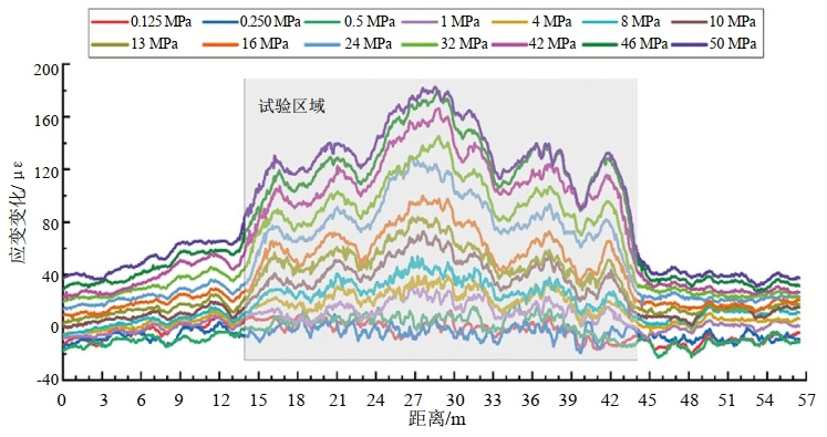 選擇一段廢棄的管道,開展土體位移狀態(tài)下光纜變形與管道變形相關(guān)性原位試驗。基本試驗思路是,在近管道邊側(cè)開挖作業(yè)坑,通過千斤頂水平方向給土體施加應(yīng)力(模擬滑坡的作用力),推動土體變形(模擬滑坡滑移變形),土體位移變形的過程中會帶動管道及光纜受力變形,同步監(jiān)測/檢測土體位移-管道應(yīng)變-光纜應(yīng)變(圖 5)。試驗最終得到管道的應(yīng)變曲線(圖 6)和伴行光纜應(yīng)變變化曲線(圖 7),分析兩者的應(yīng)變關(guān)系,可以得到如下幾點認(rèn)識:①土體位移/應(yīng)力作用下管道和光纜均出現(xiàn)明顯的應(yīng)變變化,應(yīng)變變化的形態(tài)相似,呈現(xiàn)出以推力作用為中心,中心高往兩側(cè)逐漸降低的應(yīng)變分布;②推力作用下,光纜和管道受力變形的范圍有放大效應(yīng),作用于土體推力的鋼板寬度為3.4 m,而在管道及光纜產(chǎn)生明顯的應(yīng)變變化的長度范圍約為30 m,相比于施加到土體上應(yīng)力作用寬度擴大了約9倍,這是點應(yīng)力在土體中呈扇狀擴散效應(yīng)的結(jié)果;③在同一外力作用下,管道的變形(應(yīng)變)量大于光纜的變形(應(yīng)變)量,如最后一級推力下管道中間位置的最大應(yīng)變值為300 με~350 με,相應(yīng)的伴行通信光纜的應(yīng)變值為180 με~200 με,后者約為前者的60%;④土體位移/應(yīng)力作用下光纜應(yīng)變響應(yīng)出現(xiàn)的時間早于管道應(yīng)變響應(yīng)出現(xiàn)的時間,也就是說光纜先于管道感知到外力的作用。
