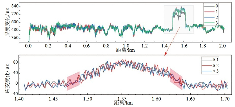 圖 8 羅針田滑坡段管道伴行光纜應(yīng)變檢測曲線(上圖)及不同時段應(yīng)變變化(下圖)