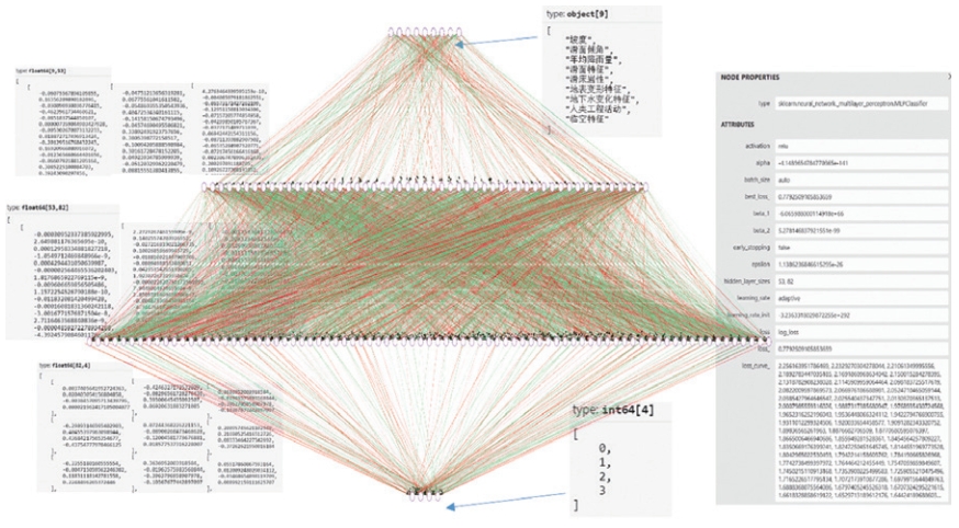 優(yōu)化后的滑坡穩(wěn)定性模型具有一個(gè)輸入層、兩個(gè)隱藏層、一個(gè)輸出層。每層節(jié)點(diǎn)數(shù)分別為9、53、82、4,模型概化見圖 4。迭代次數(shù)676次、最小損失值0.4642,激活函數(shù)relu,輸出激活函數(shù)softmax,尋優(yōu)方法adam,學(xué)習(xí)率動(dòng)態(tài)自適應(yīng)。
