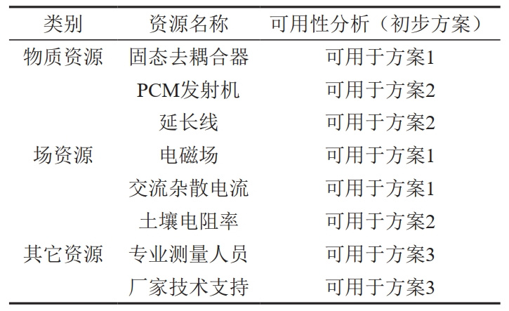 (4)理想解分析。設(shè)計(jì)的最終目的是準(zhǔn)確測(cè)量高壓線下管道位置及埋深。理想解是不進(jìn)行檢測(cè)設(shè)備系統(tǒng)改造就能滿足測(cè)量要求。達(dá)到理想解的障礙是強(qiáng)電磁干擾以及交流雜散電流干擾。出現(xiàn)這種障礙的結(jié)果是高壓線的固有電磁場(chǎng)特性。不出現(xiàn)這種障礙的條件是消除電磁場(chǎng)干擾,增強(qiáng)設(shè)備抗干擾能力。創(chuàng)造這些條件存在的可用資源是排流裝置、大功率設(shè)備、優(yōu)化接地等。