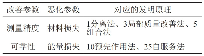 (2)轉(zhuǎn)換成TRIZ標(biāo)準(zhǔn)沖突。改善的參數(shù)包括測(cè)量精度和可靠性,惡化的參數(shù)包括材料損失和能量損失。