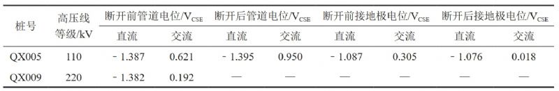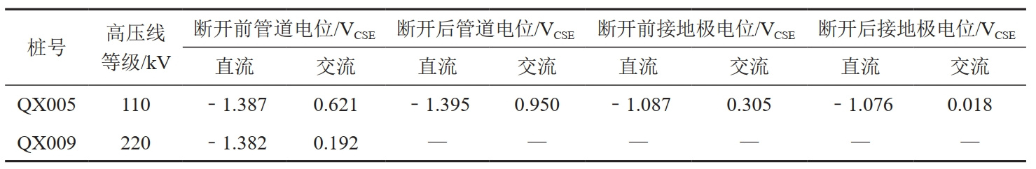 (3)測(cè)量管道位置及埋深前,對(duì)高壓輸電線路與管道交叉處的測(cè)試樁、固態(tài)去耦合器進(jìn)行了相關(guān)數(shù)據(jù)測(cè)試。由于該段管道投用了13套排流裝置,故測(cè)試點(diǎn)處接地體斷開(kāi)前后管道的交流電壓數(shù)值變化相差不大,具體測(cè)試數(shù)據(jù)如表5所示。