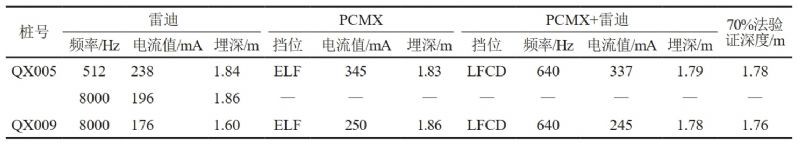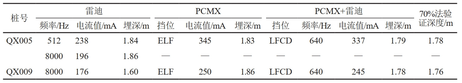 (2)選取110 kV、220 kV兩種類(lèi)型高壓線與管道交叉點(diǎn)位進(jìn)行試驗(yàn),交叉角度接近90°。采用雷迪RD8100、PCMX以及PCMX加雷迪組合的方式進(jìn)行測(cè)量,測(cè)量數(shù)據(jù)后用70%法進(jìn)行驗(yàn)證。