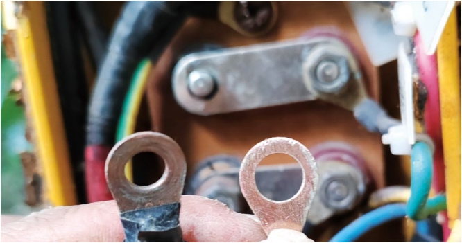 樁內(nèi)連接線常見故障有接線頭銹蝕、測試線損壞以及接線問題。日常管理中需要定期給接線柱和線頭進(jìn)行打磨處理,以確保接觸良好(圖 1)。事實(shí)證明,試片接線和參比接線的良好接觸以及是否松動(dòng)都會(huì)對設(shè)備檢測結(jié)果造成影響。圖 2 a為試片接線端打磨處理前后通斷電電位變化情況,圖 2 b為參比線重新連接前后通斷電電位變化情況。試片接線和參比接線失效,其后果等同于試片和參比失效(藍(lán)色線條為斷電電位,紅色線條為通電電位,下同)。