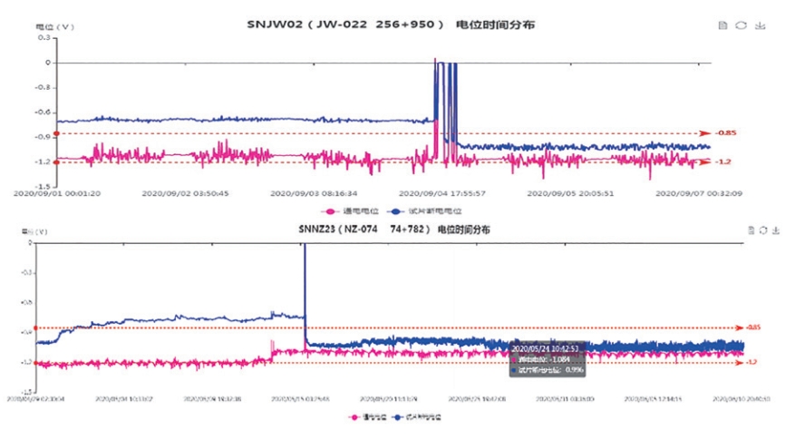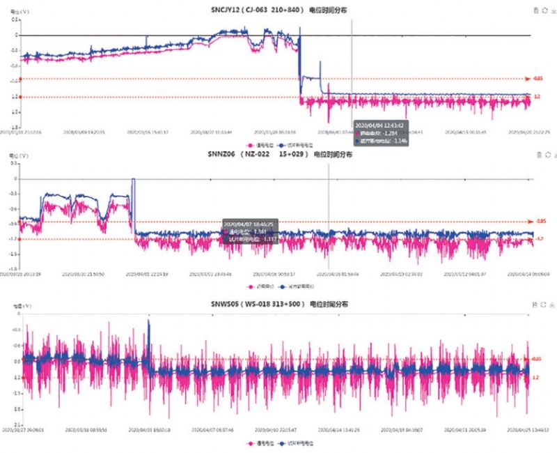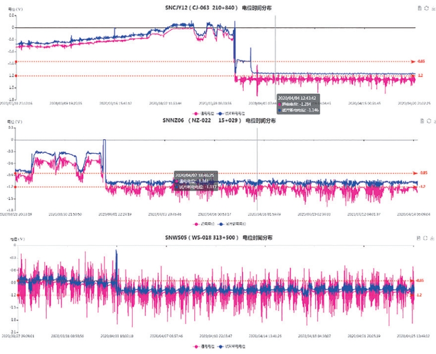 鋼制埋地輸油管道智能測試樁為管道保護(hù)提供了數(shù)據(jù)基礎(chǔ),但測試樁故障會(huì)造成陰保數(shù)據(jù)不準(zhǔn)確。現(xiàn)場實(shí)踐證明,不同部件的失效在電位曲線圖上會(huì)呈現(xiàn)不同的變化規(guī)律。做好智能測試樁樁體、智能采集儀、電源、參比電極、試片等零部件的故障排查與維護(hù),對保證電位數(shù)據(jù)的真實(shí)性具有重要的意義。