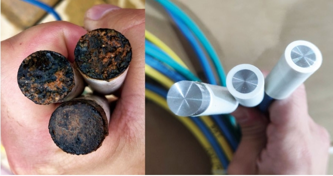 (2)試片的檢測方法。為了消除IR降,以更準(zhǔn)確地檢測出斷電電位,試片通常埋設(shè)在管道附近。SN管道上用于檢測直流斷電電位的試片面積為6.5 cm2。雖然試片與管道連接并受陰極保護(hù),但由于長期埋設(shè)在地下,特別是在南方地區(qū)水位較高且長時(shí)間泡在水中,會(huì)導(dǎo)致附著物或沉淀物的形成,如圖 5所示。此外,地下水位的上升或者下降也可能導(dǎo)致試片與土壤之間出現(xiàn)間隙,從而影響斷電電位的準(zhǔn)確性。