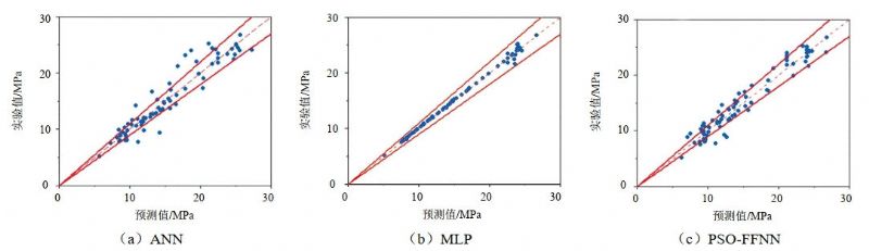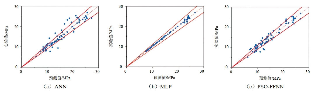 文中采用的數(shù)據(jù)來(lái)自文獻(xiàn)[2]中的實(shí)驗(yàn)數(shù)據(jù),預(yù)測(cè)值越靠近中間的紅色虛線,預(yù)測(cè)結(jié)果越接近實(shí)驗(yàn)值。虛線兩側(cè)的紅色實(shí)線表示預(yù)測(cè)值與實(shí)驗(yàn)值誤差為±10%。在三種預(yù)測(cè)模型訓(xùn)練結(jié)果中,MLP模型的訓(xùn)練結(jié)果最好,所有預(yù)測(cè)結(jié)果的誤差均在±10%以內(nèi),而ANN和PSO-FFNN的訓(xùn)練結(jié)果都有部分樣本預(yù)測(cè)誤差超過(guò)了±10%(圖 4)。