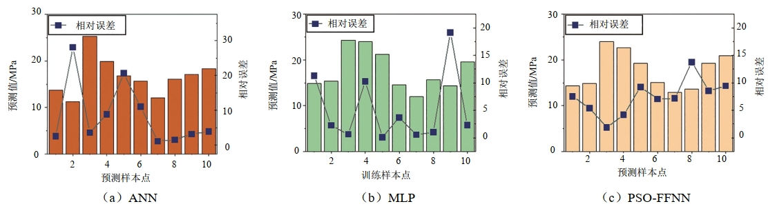 結(jié)合三種預(yù)測(cè)模型的預(yù)測(cè)結(jié)果(圖 5),柱狀圖顯示的是三種模型的預(yù)測(cè)值,折線圖顯示的是每個(gè)預(yù)測(cè)樣本點(diǎn)的相對(duì)誤差。可以看出,ANN模型最大相對(duì)誤差接近30%,三個(gè)樣本點(diǎn)相對(duì)誤差大于10%。MLP模型的最大相對(duì)誤差接近20%,三個(gè)樣本點(diǎn)相對(duì)誤差大于10%。而PSO-FFNN模型最大相對(duì)誤差接近15%,其余樣本點(diǎn)相對(duì)誤差均小于10%。從預(yù)測(cè)結(jié)果看,PSO-FFNN模型的預(yù)測(cè)結(jié)果最為穩(wěn)定。