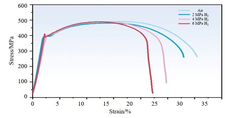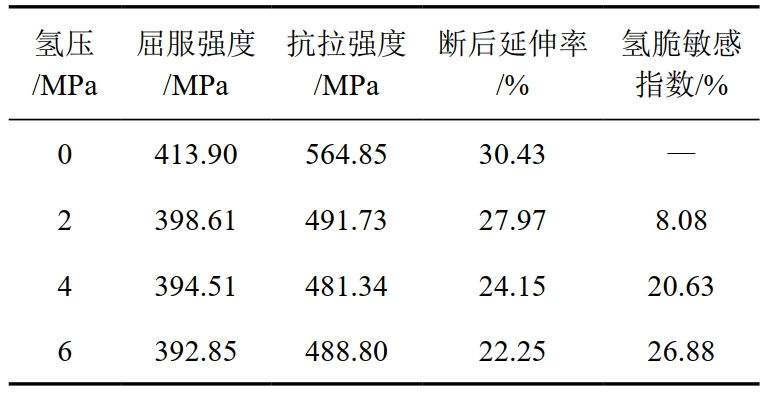 (1)對(duì)比2 MPa、4 MPa、6 MPa氫壓下的慢速率拉伸試驗(yàn)結(jié)果,X52管線鋼的屈服強(qiáng)度略有降低,抗拉強(qiáng)度和斷后延伸率均減小,氫脆敏感性增大,氫脆敏感指數(shù)分別為8.08%、20.63%、26.88%。
