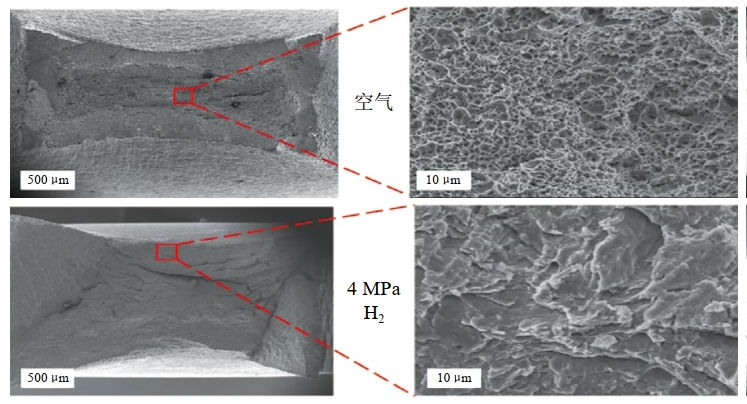 分析斷口微觀形貌(圖 4),X52鋼在空氣環(huán)境中進(jìn)行試驗(yàn)后斷口呈典型韌性斷裂特征,斷口中心呈等軸韌窩,韌窩大小不一。但隨著氫壓的上升,拉伸斷口由韌性斷裂向解理斷裂轉(zhuǎn)變,解理區(qū)域從外側(cè)向中心處延伸,出現(xiàn)解理臺(tái)階狀特征,與慢速率拉伸結(jié)果一致。