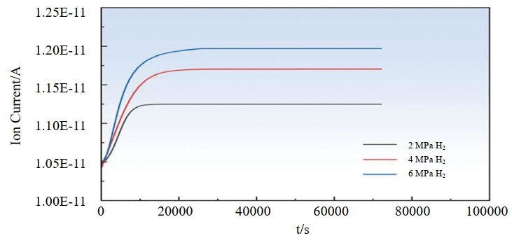 采用氫含量測(cè)試儀HTDS-003對(duì)X52管線鋼的氫含量進(jìn)行測(cè)定。將X52鋼切割成尺寸為20 mm×10 mm×3 mm的塊狀試樣,使用SiC砂紙打磨至2500#,進(jìn)行機(jī)械和電解拋光,去除表面殘余應(yīng)力,記錄試樣重量。分別在氫氣壓力為2 MPa、4 MPa、6 MPa的條件下對(duì)試樣進(jìn)行預(yù)充氫,充氫時(shí)間為24 h。提前對(duì)測(cè)試儀器進(jìn)行氫氣標(biāo)定,以便于充氫完成后將試樣在1 min內(nèi)裝入設(shè)備并進(jìn)行測(cè)定。測(cè)定溫度范圍為室溫至800℃,升溫速率為100℃/h。
