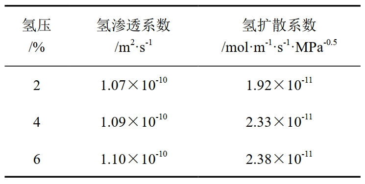 結(jié)合不同氫壓下氣相氫滲透曲線(圖 5),測(cè)氫端氫氣的信號(hào)隨著氫壓的升高而增大。開始測(cè)試時(shí)材料的氫氣信號(hào)快速增長(zhǎng),隨后增速降低,最后趨于一個(gè)穩(wěn)定值,此時(shí)氫滲透達(dá)到平衡。計(jì)算得到材料的氣相氫滲透的動(dòng)力學(xué)參數(shù)(表 2)。氫在材料中的行為受到多因素影響,分為材料本身特性和環(huán)境因素。其中材料本身特征為表面粗糙度、組織均勻性等。本次試驗(yàn)前對(duì)試樣進(jìn)行打磨拋光處理,且金相組織均勻,故氫擴(kuò)散行為結(jié)果的差異性主要與環(huán)境因素有關(guān)。隨著氫壓的增大,試樣表面接觸的氫氣分子濃度增大,導(dǎo)致氫滲透系數(shù)Φ增大,氫擴(kuò)散系數(shù)D不變。因此,氫分壓對(duì)氫滲透系數(shù)Φ有影響。