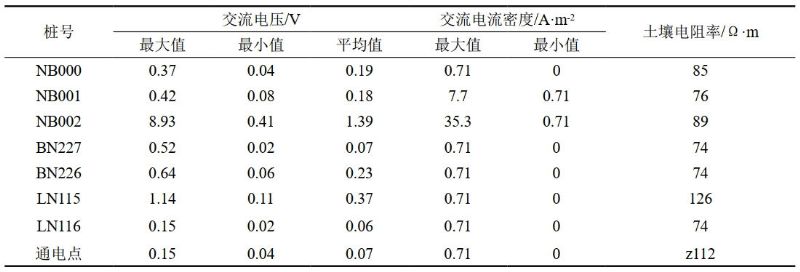 通過交流檢測數(shù)據(jù)可以看出,南寧—黎塘管線LN116#~LN115#測試段、南寧—北海管線BN227#~BN226#測試段、南寧—百色管線NB000#~NB002#測試段交流干擾電壓均小于4 V,交流電流密度均小于30 A/㎡,交流干擾程度符合規(guī)范要求。