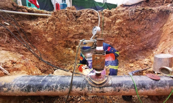某機(jī)場(chǎng)在役Φ219 mm航空煤油管道設(shè)計(jì)壓力6.4 MPa,運(yùn)行壓力3.5 MPa,全長(zhǎng)17.8 km、高程差240 m。某晚,管道在停輸回流狀態(tài)下出現(xiàn)壓力異常,3小時(shí)內(nèi)管道靜壓下降了0.5 MPa,經(jīng)初步排查,排除溫差影響,認(rèn)為管道壓降可能是因泄漏導(dǎo)致。為盡快排查壓降原因,管道管理單位聯(lián)合搶險(xiǎn)單位利用補(bǔ)板式卡具排查輸油管道泄漏點(diǎn)工藝,進(jìn)行分段試壓,逐段縮小疑似泄漏點(diǎn)范圍,用時(shí)4天排查完全線管道,結(jié)合外防腐檢測(cè)、彈性波測(cè)漏技術(shù),成功找到了管道腐蝕泄漏點(diǎn),后采用帶壓焊接B型套筒方式完成管道修復(fù)。