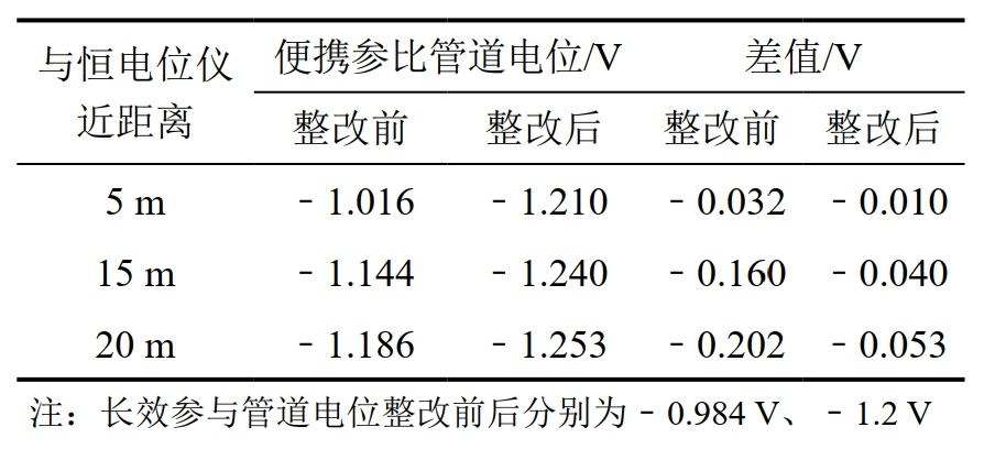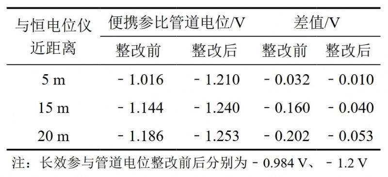 (2)對(duì)恒電位儀周邊管地電位進(jìn)行檢測(cè)。分別測(cè)量整改前后距離恒電位儀5米、15米、20米管地電位,整改前管地電位隨距離增加逐漸偏負(fù),驗(yàn)證了閥門電動(dòng)執(zhí)行機(jī)構(gòu)接地產(chǎn)生陰極電場(chǎng)對(duì)管地電位的影響,管地電位最大差值達(dá)到202 mV,整改后差值減小至53 mV,通電電位為﹣1.15 V至﹣1.24 V之間,管道遠(yuǎn)端電位恢復(fù)正常(表 1)。