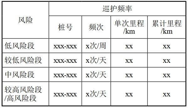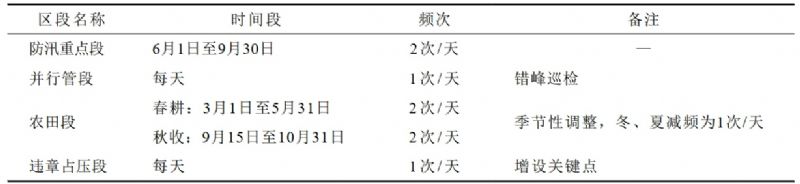 傳統(tǒng)的管道巡護(hù)模式多以巡護(hù)人員巡護(hù)長(zhǎng)度相同、每天執(zhí)行均等任務(wù)為主,這樣造成風(fēng)險(xiǎn)較小的區(qū)段“過”巡,風(fēng)險(xiǎn)相對(duì)較大的區(qū)段“欠”巡,隱患得不到及時(shí)發(fā)現(xiàn)和消除。差異化巡檢是指根據(jù)管道所處地理環(huán)境和區(qū)段風(fēng)險(xiǎn)等級(jí),確定巡檢周期和頻次,實(shí)現(xiàn)由“線”為單位的固定周期和頻次向以“段”為單位有側(cè)重點(diǎn)、動(dòng)態(tài)調(diào)整周期和頻次的巡檢模式轉(zhuǎn)變,最大限度提高風(fēng)險(xiǎn)管控效果,降低安全環(huán)保事故發(fā)生概率。