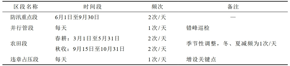 對(duì)于受外界或季節(jié)性干擾相對(duì)較大的特殊區(qū)段,包括但不限于違章占?jí)憾巍⒎姥粗攸c(diǎn)段、管道并行段,例如管道途徑農(nóng)田地,在春耕和秋收季節(jié),可采取增加巡護(hù)頻次的方法控制風(fēng)險(xiǎn);夏季和冬季可減頻巡檢,此種情況具有相對(duì)靈活的特征(表 2)。