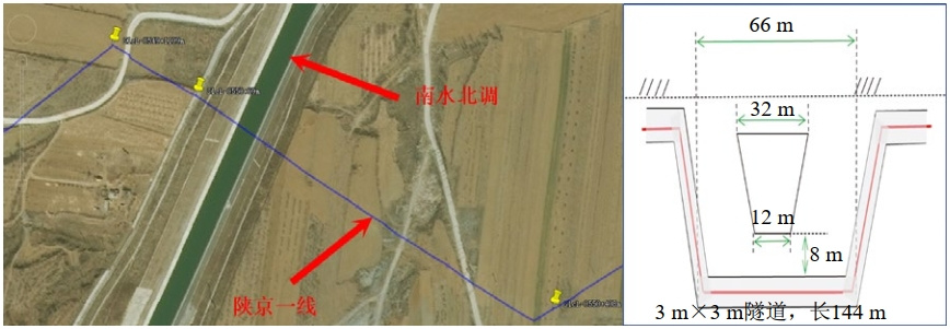 陜京一線管道于1997年投產(chǎn),2008年南水北調(diào)中線干線與陜京一線管道進行交叉段改造工程作業(yè),管道由大開挖改為以隧道形式從南水北調(diào)工程底部通過,隧道深度為27.51 m,地面跨度為147.84 m,隧道實長為159.64 m,交叉角度90°,穿越點位于保定市易縣橋頭鄉(xiāng)南留召村,樁號:S1cH-0551+1-S1cH-0551+2(圖 1)。