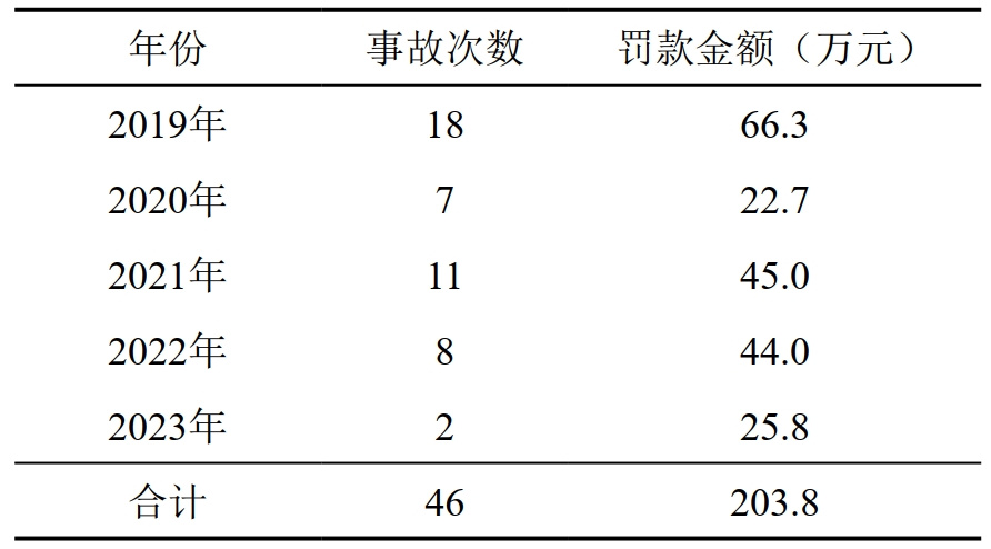 2019年以來,武漢市第三方施工破壞燃?xì)夤芫W(wǎng)事故數(shù)共計46起,對涉事第三方責(zé)任單位累計罰款金額203.8萬元。其中2019年至2022年4年間事故數(shù)為44起,年均11起,累計罰款178萬元,平均每起罰款4.05萬元。2023年事故數(shù)僅2起,累計罰款金額25.8萬元,平均每起罰款金額12.9萬元(表 1)。