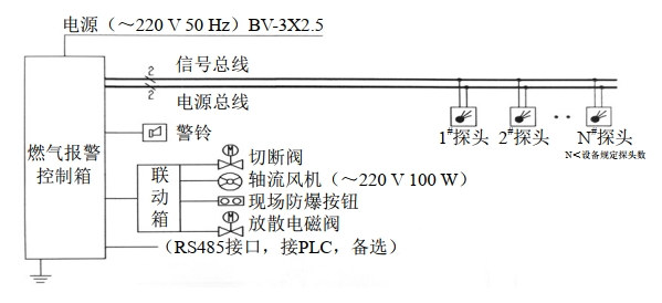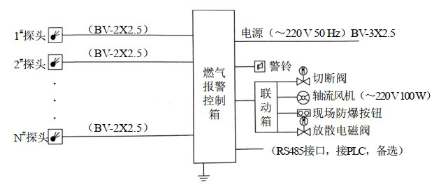圖 2 可燃氣體報警系統(tǒng)示意圖(分線制)