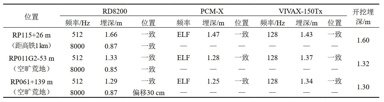 (2)驗證情況。采用RD8200(512 Hz和8k Hz)、PCM-X(低頻ELF)、VIVAX-150Tx(128 Hz)三種設(shè)備及不同頻率信號對光纜埋深、位置進行復(fù)測及開挖驗證(表 1),當采用RD8200(8k Hz)高頻信號時,復(fù)測結(jié)果與實際開挖埋深相差較大,且有一處位置偏移30 cm;當采用RD8200(512 Hz)、PCM-X(低頻ELF)、VIVAX-150Tx(128 Hz)低頻信號時,復(fù)測結(jié)果與實際開挖埋深比較一致。