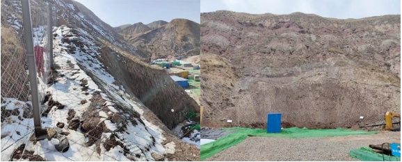 現(xiàn)場施工時(shí)由于場地受限,將石圈定向鉆入土點(diǎn)前移6 m,對山體進(jìn)行削方并同步進(jìn)行山體防護(hù)。采用主動(dòng)防護(hù)和被動(dòng)防護(hù)相結(jié)合的方式。山體防護(hù)網(wǎng)結(jié)構(gòu)配置為:鋼絲繩網(wǎng)+鋼絲格柵+邊緣鋼絲繩錨桿+支撐繩+縫合繩,防護(hù)網(wǎng)方式為:內(nèi)網(wǎng)網(wǎng)孔6 cm,外網(wǎng)采用8號鋼絲繩,網(wǎng)孔30 cm×30 cm,配件采用16號橫向支撐繩,12號縱向支撐繩及8號縫合繩,防護(hù)網(wǎng)采用鋼絲繩錨桿,錨桿直徑18 mm,長2 m,間距4.5 m×4.5 m,梅花形布置,共計(jì)布設(shè)1000 m²主動(dòng)防護(hù)網(wǎng),100 m²被動(dòng)防護(hù)網(wǎng)(圖 2)。