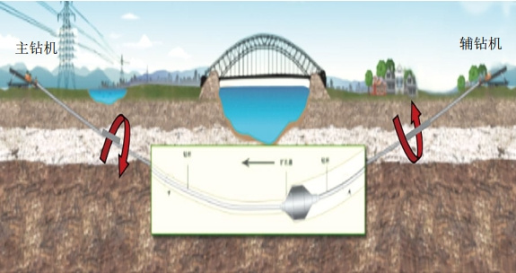 施工措施:①采用出入土端雙鉆機(jī)進(jìn)行擴(kuò)孔施工,降低主鉆機(jī)的扭矩,減小卡鉆、斷裂的風(fēng)險(xiǎn)(圖 4);②長距離穿越擴(kuò)孔扭矩大,采用高強(qiáng)度鉆桿,設(shè)計(jì)采用全新6-5/8″ S135鉆桿;③大級別擴(kuò)孔時(shí),在擴(kuò)孔器前后各加一小直徑擴(kuò)孔器過渡,且擴(kuò)孔器之間使用柔性鉆桿連接,避免了應(yīng)力集中,減少鉆具斷裂事故發(fā)生;④擴(kuò)孔扭矩大,可采用正擴(kuò)工藝擴(kuò)孔。
