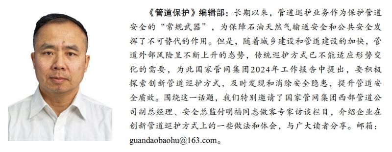 編輯部:國(guó)家管網(wǎng)集團(tuán)2024年工作報(bào)告提出,要積極探索創(chuàng)新管道巡護(hù)方式。近年來(lái)西部管道公司開展了哪些工作,您認(rèn)為實(shí)現(xiàn)這一目標(biāo)還要做哪些努力?