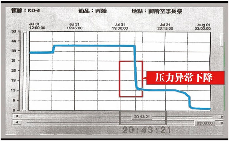 1974年至1979年間,臺(tái)灣有關(guān)部門(mén)為了改善基礎(chǔ)設(shè)施及實(shí)現(xiàn)產(chǎn)業(yè)升級(jí),進(jìn)行了十大基礎(chǔ)設(shè)施建設(shè),高雄區(qū)成為發(fā)展石化等重工業(yè)的重鎮(zhèn)。市區(qū)道路下方埋設(shè)了復(fù)雜的石化管線,與市政建設(shè)的水電設(shè)施交錯(cuò)在一起,就此埋下了隱患。此次氣爆的范圍擴(kuò)及2~3公里范圍內(nèi)的多個(gè)街道,這是因?yàn)楫?dāng)丙烯發(fā)生泄漏時(shí),第一時(shí)間到場(chǎng)的消防隊(duì)、石化企業(yè)及市政建設(shè)主管部門(mén)都無(wú)法精確掌握管線設(shè)施的基本情況,泄漏的丙烯氣體隨著地下排水箱涵流竄至多個(gè)街道,隨后陸續(xù)觸及火花而接連引爆。災(zāi)后調(diào)查發(fā)現(xiàn),泄漏發(fā)生時(shí),使用該管線輸送丙烯的供應(yīng)及接收企業(yè)已察覺(jué)到輸送過(guò)程有不正常的壓力下降(圖 3),但卻不明究理而持續(xù)輸送,更加劇了爆炸的規(guī)模,不僅炸翻多條路面,甚至將路邊停放的汽車(chē)炸飛至三樓頂,直接財(cái)產(chǎn)損失數(shù)十億臺(tái)幣以上。后續(xù)衍生的問(wèn)題還包括:民眾對(duì)地下石化管線莫名的恐懼與抗?fàn)帲a(chǎn)業(yè)發(fā)展停滯且面臨存廢的挑戰(zhàn),以及地方政府與上級(jí)石化監(jiān)管權(quán)責(zé)的爭(zhēng)議不休。
