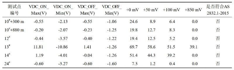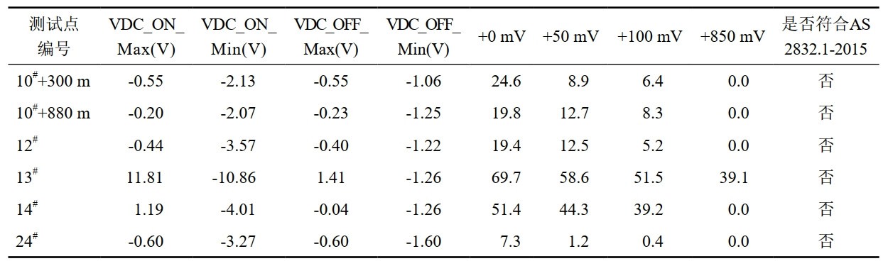 以斷電電位正于保護準(zhǔn)則0 mV的時間不超過總監(jiān)測時間5%,正于保護標(biāo)準(zhǔn)+50 mV的時間不超過總監(jiān)測時間2%,正于保護標(biāo)準(zhǔn)+100 mV的時間不超過總監(jiān)測時間1%,正于保護標(biāo)準(zhǔn)+850 mV的時間不超過總監(jiān)測時間0.2%,作為評判依據(jù)對試驗管段陰保是否合格進行對比評判。