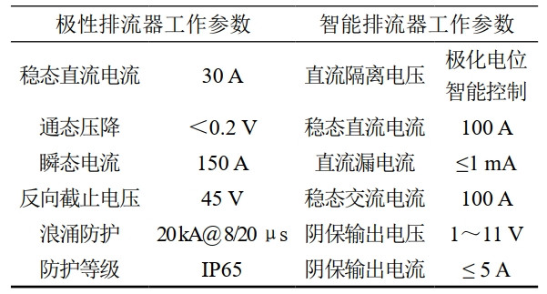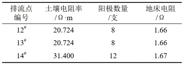 各排流點陽極皆為ZP-5型,18 kg鋅陽極。現(xiàn)場水平布置,陽極放置在填料包中,間隔2 m,埋深1.5 m。根據(jù)陽極地床狀況(表 3),設(shè)置極性排流器及智能排流器工作參數(shù)(表 4)。