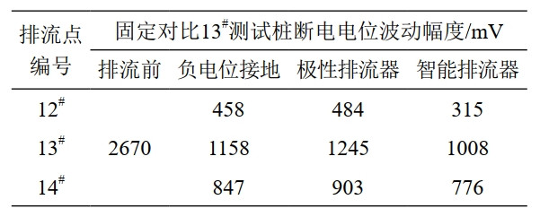 根據(jù)試驗方案分別在12#、13#、14#測試樁排流點采用負(fù)電位接地排流、極性排流器排流、智能排流器排流三種排流方式,在排流的同時固定在13#測試樁監(jiān)測各種排流方式下測試樁陰保數(shù)據(jù)(表 5),不同排流點排流時,監(jiān)測各排流方式斷電電位波動幅度。