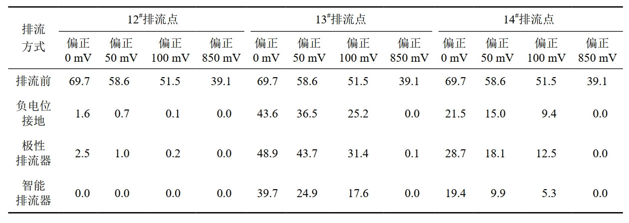 (1)排流點不同,排流效果差異明顯。安裝排流防護設(shè)施時需要進行詳細(xì)的測試試驗,選擇合適的排流防護點,才能最大限度發(fā)揮排流設(shè)施的作用,達(dá)到提高管道保護效果的作用。