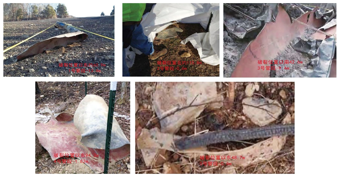 事故現(xiàn)場爆炸坑大約長32 m、寬13.4 m,深度從3.96 m~7.62 m不等。破裂現(xiàn)場南側(cè)管道埋深約1.43 m、北側(cè)約2.59 m,破裂位置剩余管道的開口端間距約24.38 m(圖 2)。北側(cè)管道末端環(huán)繞管道周長約一半的環(huán)焊縫斷裂,南側(cè)管道末端則表現(xiàn)出不均勻的外觀,表明相鄰管道從該位置撕裂。
