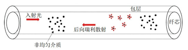 由于光纖在拉絲制作生產過程中存在著質量、密度等參數(shù)的不均勻分布,從而導致光在光纖中傳播時會發(fā)生散射現(xiàn)象。光在光纖中的散射方向為隨機分布,其中一部分散射的光會沿著入射光相反的方向傳播,故稱之為后向散射。光纖的后向散射根據(jù)散射因素的不同可分為瑞利散射、布里淵散射和拉曼散射。其中DAS主要應用光纖的后向瑞利散射實現(xiàn)。