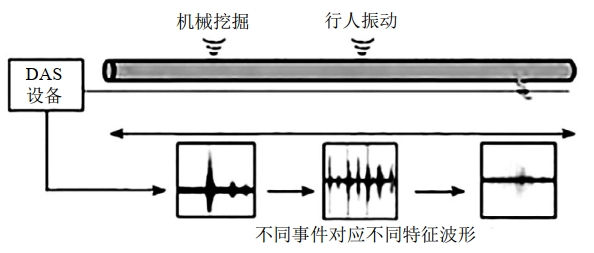分布式光纖聲波傳感器(Distributed Fiber Acoustic Sensing,簡稱DAS)利用管道同溝鋪設的光纖,通過探測脈沖光在光纖中的瑞利散射的相位變化測量光纖受到的振動,從而實現(xiàn)對管道周邊振動事件(如第三方施工、管道泄漏、人為破壞等)的及時感知。該技術具有以下特點:一是無需重新鋪設新的光纜,原同溝敷設的通信光纜便可進行測量;二是探測距離長,靈敏度高,感知精度高,能實現(xiàn)全天候在線監(jiān)測;三是成本低,安裝方便,不受電磁干擾。