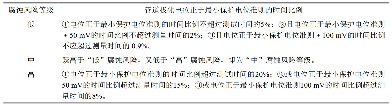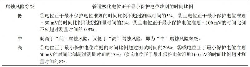 基于極化電位的評判指標(biāo):交流電流密度低于30 A/m²時,電位應(yīng)為﹣0.85 V~﹣1.10 V之間;交流電流密度在30 A/m²~100 A/m²時,電位應(yīng)在﹣0.95 V~﹣1.10 V之間。