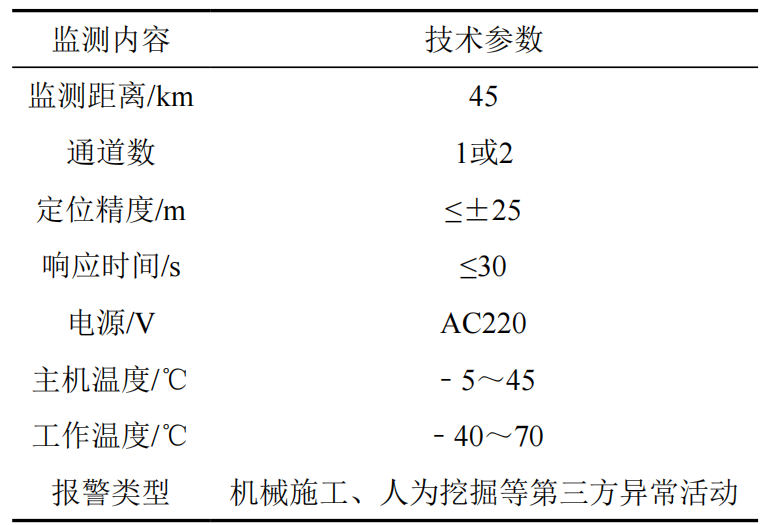 (1)技術(shù)原理。將光纖沿著管道敷設(shè),利用光纖的光散射、折射率等特性變化來(lái)感知管道周?chē)臏囟取毫Α?yīng)變等物理量。當(dāng)管道泄漏時(shí),泄漏介質(zhì)與周?chē)h(huán)境的相互作用會(huì)引起這些物理量的改變,光纖傳感器能夠?qū)崟r(shí)捕捉到這些變化并準(zhǔn)確定位泄漏位置。光纖傳感技術(shù)具有分布式監(jiān)測(cè)、抗電磁干擾、高靈敏度等優(yōu)點(diǎn),在管道泄漏檢測(cè)中得到了廣泛應(yīng)用[2]。表 1是光纖傳感監(jiān)測(cè)的主要技術(shù)參數(shù)。