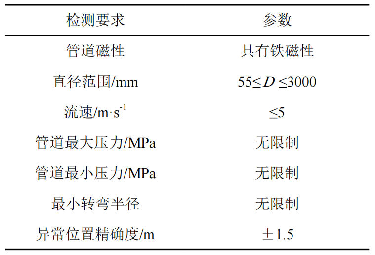 (1)技術(shù)原理。智能清管技術(shù)能夠充分利用日常管道清管時(shí)機(jī),通過(guò)常規(guī)清管器、測(cè)徑清管器、鋼刷清管器、變形清管器和漏磁清管器等一系列清管措施,對(duì)管道內(nèi)部各類(lèi)缺陷(凹陷變形、腐蝕減薄、焊縫異常等)進(jìn)行檢測(cè)。在清管作業(yè)過(guò)程中,它可以實(shí)時(shí)采集管道內(nèi)壁的厚度、腐蝕情況、缺陷位置等信息,為管道的維護(hù)和泄漏預(yù)防提供數(shù)據(jù)支持[3]。表 2為常規(guī)漏磁清管器技術(shù)參數(shù)。