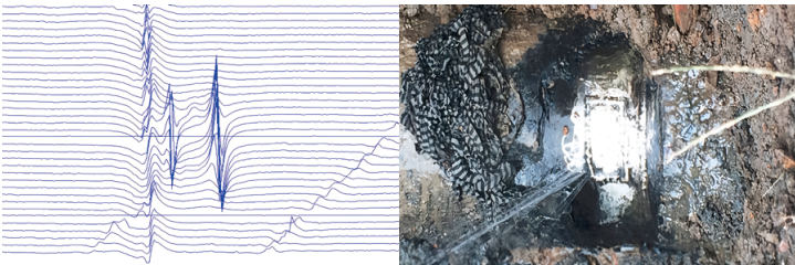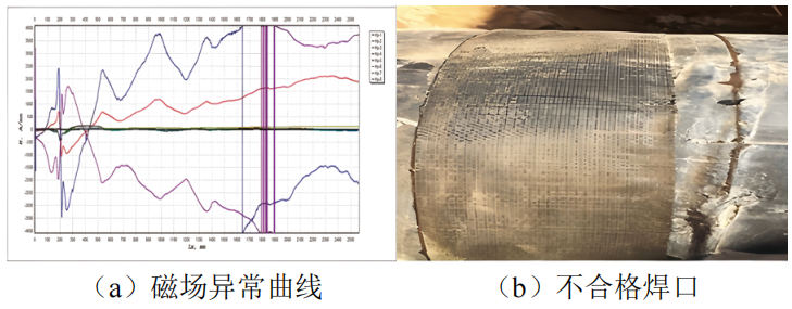以某天然氣集輸管道為例,管道長(zhǎng)度41 km,管徑Φ508 mm×9/11 mm,運(yùn)行壓力4.87 MPa ~4.92 MPa。由于設(shè)計(jì)問(wèn)題,該管道暫時(shí)無(wú)法進(jìn)行智能清管器檢測(cè),于2024年開(kāi)展了非接觸式磁檢測(cè)。檢測(cè)發(fā)現(xiàn):管道整體質(zhì)量良好,無(wú)變形、無(wú)表面凹坑,防腐層破損28處,存在1處不合格焊口(圖 5)。屬地單位立即組織對(duì)缺陷管段進(jìn)行更換及外防腐層修復(fù),有效預(yù)防了管道泄漏事件的發(fā)生。
