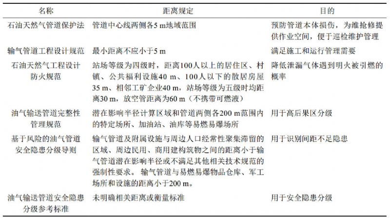 (2)規(guī)范層面。目前國家還沒有制定與《石油天然氣管道保護法》第十三條和三十一條相配套的技術(shù)規(guī)范。GB 50251―2015《輸氣管道工程設(shè)計規(guī)范》規(guī)定,埋地管道與建(構(gòu))筑物的間距應(yīng)滿足施工和運行管理需求,且管道中心線與建(構(gòu))筑物的最小距離不應(yīng)小于5 m。其條文說明解釋該5 m距離的依據(jù)是《石油天然氣管道保護法》第三十條規(guī)定,同時兼顧了管道施工和運行維護需要。GB 50183―2004《石油天然氣工程設(shè)計防火規(guī)范》僅對不同等級的天然氣站場和放空管與周邊人員、建(構(gòu))筑物的間距作出了具體規(guī)定,但其條文說明中將這些距離解釋為防火距離而非安全距離。GB 32167―2015《油氣輸送管道完整性管理規(guī)范》則是通過地區(qū)等級、潛在影響半徑及管道中心線兩側(cè)各200米等條件來確定高后果區(qū)分級,并非對安全距離的直接規(guī)定。GB/T 34346―2017《基于風(fēng)險的油氣管道安全隱患分級導(dǎo)則》中雖然在附錄D表D.1隱患處置方法中提到與周邊人員、建(構(gòu))筑物安全距離不足,但全文未明確安全距離的具體數(shù)值或定義,而是將間距不足作為隱患識別的方法,具體間距則以輸氣管道潛在影響半徑或不滿足其他相關(guān)技術(shù)規(guī)范的強制性要求來界定。