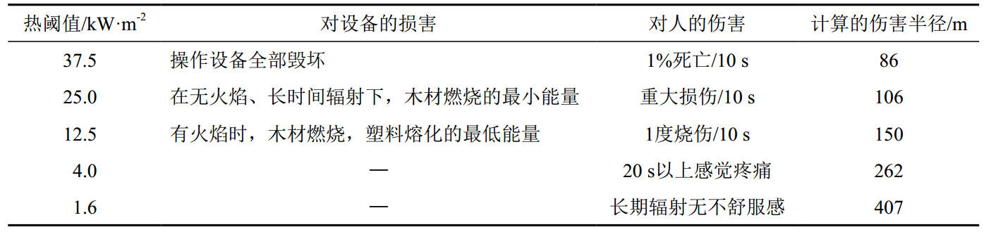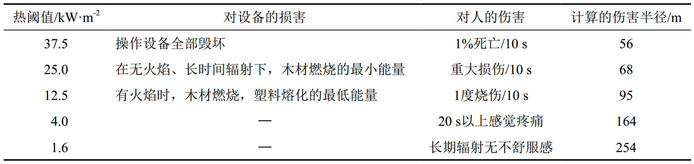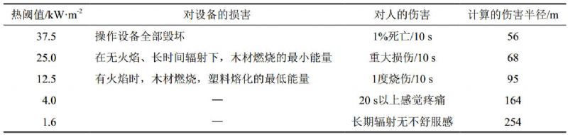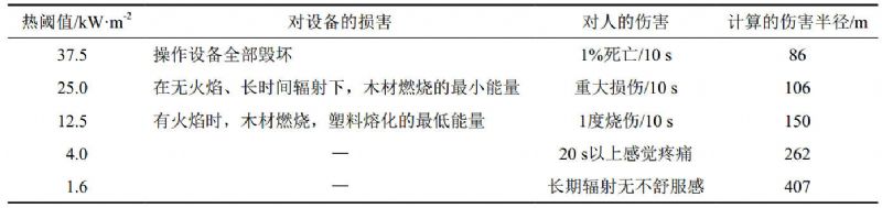 天然氣長輸管道多數(shù)埋設(shè)于地表以下,管道發(fā)生泄漏時遇到火源會被直接點燃形成噴射火。按照最不利情形并結(jié)合實踐經(jīng)驗進行假定,以管口完全斷裂形成水平噴射火作為研究對象,分析計算水平噴射火熱輻射通量并根據(jù)已知不同目標的熱毀傷閾值進行反算[1],從而得到水平噴射火的傷害半徑。同時,采用熱輻射強度準則,對比已知不同目標的熱毀傷閾值,可以得到相應(yīng)的傷害半徑[2],結(jié)果見表 3。