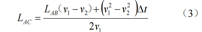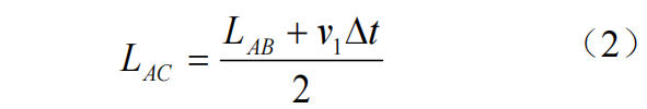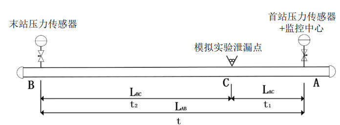 圖 1中原油管道長度為LAB,m;模擬泄漏點為C。泄漏點C產(chǎn)生的壓力波傳到首站A點的時刻設(shè)為 t1,s;傳到末站B點的時刻為 t2,s;已知原油管道的長度和輸送的介質(zhì),忽略原油的黏度、溫度、流動狀態(tài)等因素的影響,壓力波在原油中的傳播速度為 v1,m/s;原油在管道的流速為v2,m/s。則: