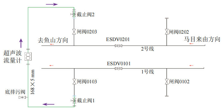 由于該輸油管道是雙管同溝敷設(shè),在輸油管道沿途的其中1個閥室進行工藝改造,1號、2號管線旁通管線平板閘閥0103和0203處,拆掉目前封堵的盲法蘭,安裝好臨時工藝閥組和截止閥,模擬泄漏試驗工藝閥組安裝位置如圖 2綠色管線位置所示。